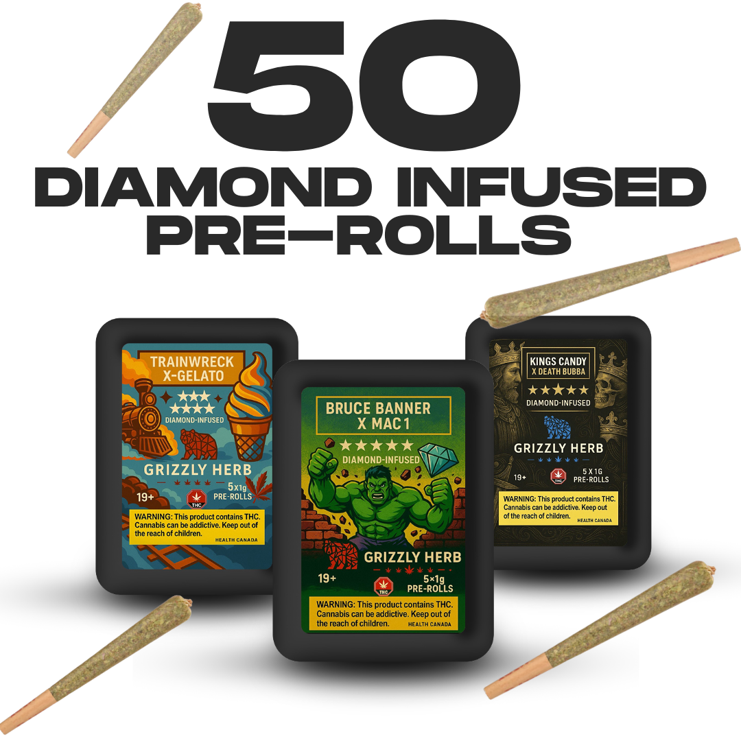 You get 10 individual Grizzly Herb packs, each containing 5 × 1g diamond-infused pre-rolls (50 total). A powerful mix of some of our most popular strains: